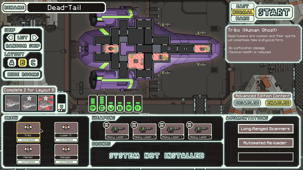 I tried to do a Normal test run with the new ship. I didn't actually get to do much testing, as I made it to the end of sector 6 without buying anything other than shields and drones. I ran out of fuel because I just gave away 4 fuel in two separate events before landing on the exit beacon with none left. Without having acquired any extra firepower, I couldn't fight the rebels for fuel because I needed a 100% hit rate, which I obviously wasn't getting. During this run, I acquired a human and a mantis; I kept my clonebay active for them.