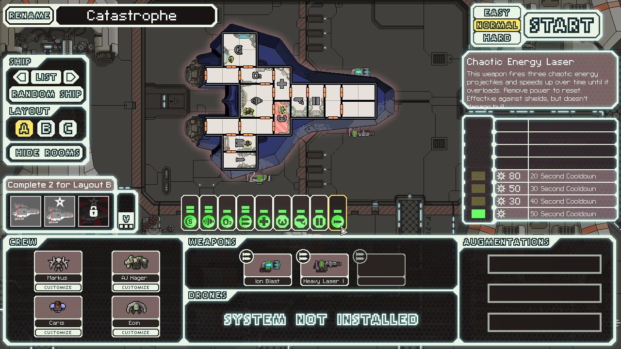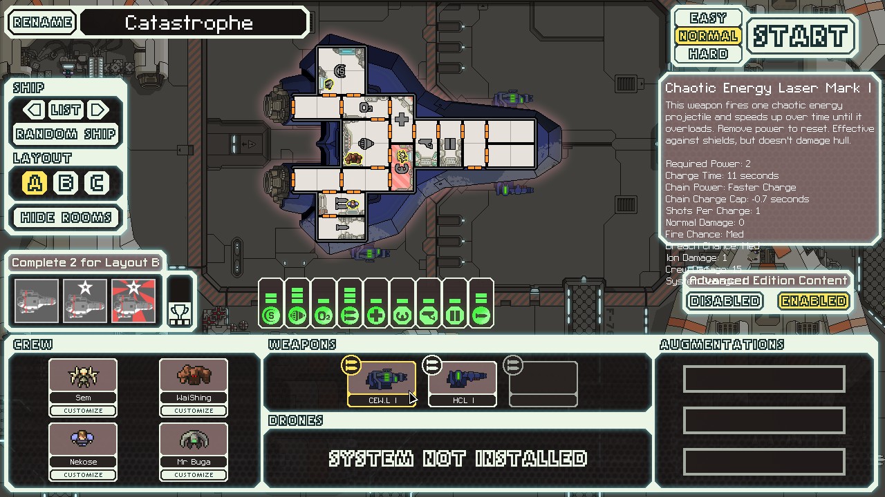 >Custom weapons match hull color instead of default RAD Weapon Pack colorsStarts with a Lanius, Rock, Human, Engi, Chaotic Energy Laser, Heavy Chain Laser, and basic systems in addition to the artillery.