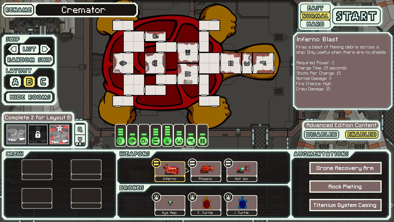 -Inferno Blast: 15 projectiles over a huge area, does no hull damage (requires shields down), high fire chance, minor crew damage