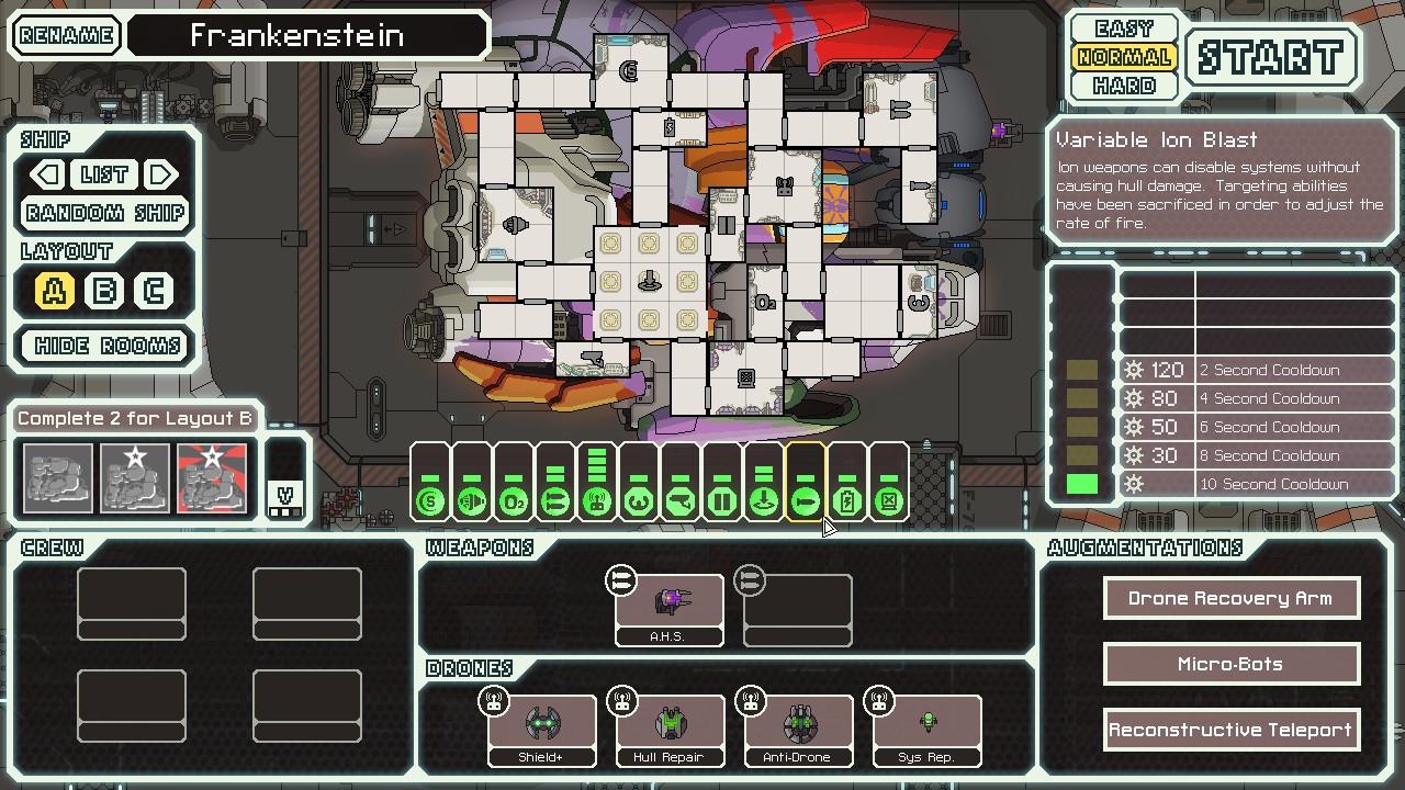 This ship has no damaging weapons other than the Engi that inhabit it. They bring with them a powerful hacking tool and an experimental Ion Blast.